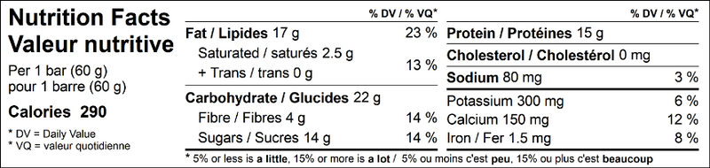 Ingredients: Almond butter (roasted almonds), Sugars (honey), Whey protein isolate, Roasted almonds, Cocoa powder, Chocolate chips (cane sugar, unsweetened chocolate, cocoa butter, milk powder, soy lecithin, natural flavour), Instant coffee, Natural flavours. Contains: Tree nuts (almonds), Milk, and Soy. May contain: Peanuts, Tree nuts, Egg, Sesame and Wheat.